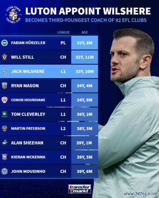 10月14日讯 德国转会阛阓清点了英国前四级别联赛球队主考验年级情况,卢顿新帅威尔希尔以33岁10个月成第三年青主考验。