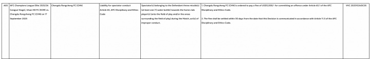 1-成皆蓉城俱乐部因违犯亚足联《范例与谈德准则》第65.1条,被责令支付3000好意思元罚金。