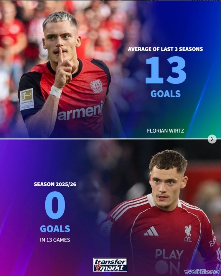 维尔茨:本赛季在利物浦13场0球,此前3个赛季平均13球