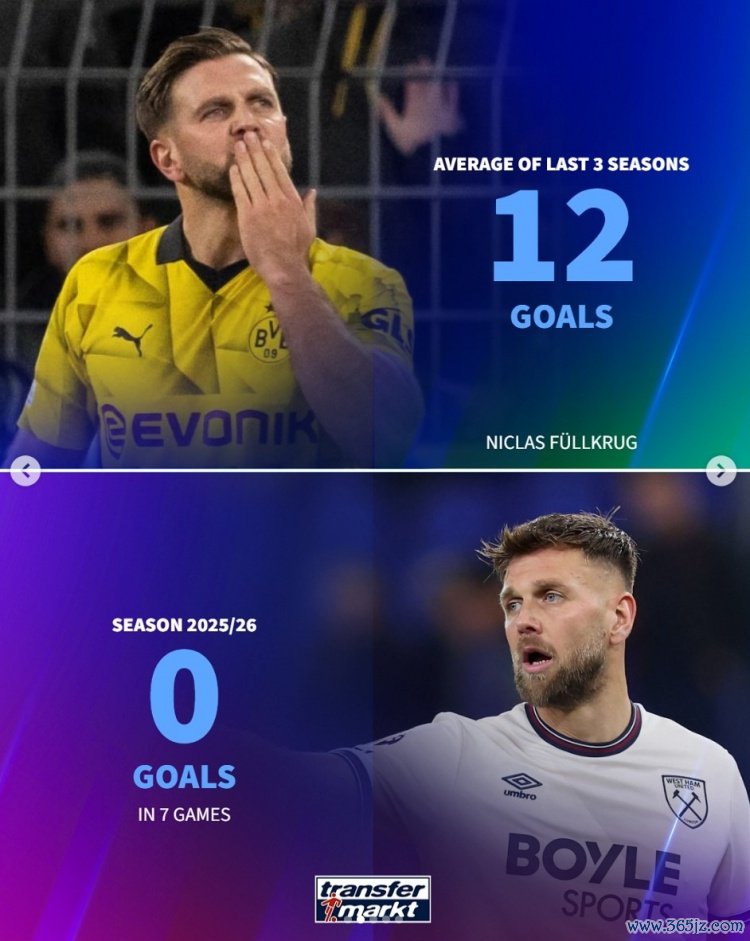 菲尔克鲁格:本赛季在西汉姆7场0球,此前3个赛季平均12球