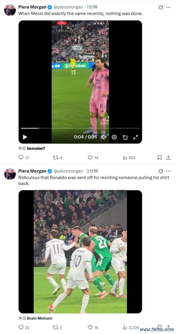 此前,摩根曾在社媒屡次声援染红的C罗,远隔晒出C罗与梅西的视频,并示意C罗因为起义他东说念主拉扯球衣而被红牌罚下很是裂缝,此外梅西最近近似的手脚却莫得遭到刑事连累。