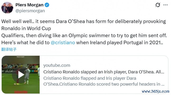 此外,摩根还曾示意C罗比赛中肘击的爱尔兰队后卫奥谢早有前科,他曾活着初赛成心寻衅C罗而被后者击打手臂。