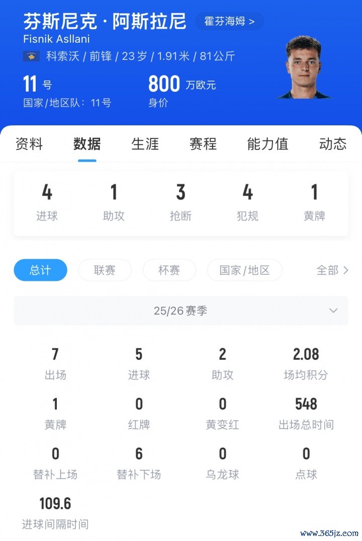 阿斯拉尼现年23岁,身高1.91米,他本赛季出场7次,孝敬5球2助,现身价800万欧,他与霍芬海姆的协议将在2029年到期。