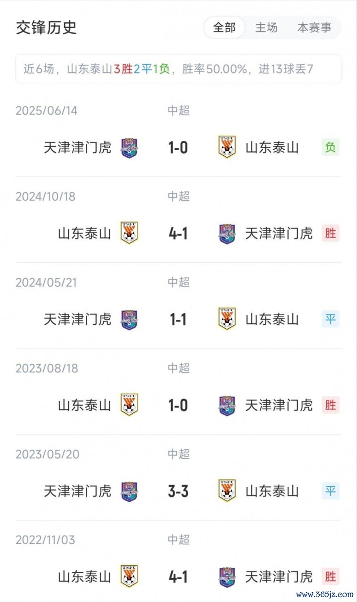 泰山暂列中超第5名,13胜8平7负积47分;津门虎紧随自后排在第6名,12胜8平8负积44分。