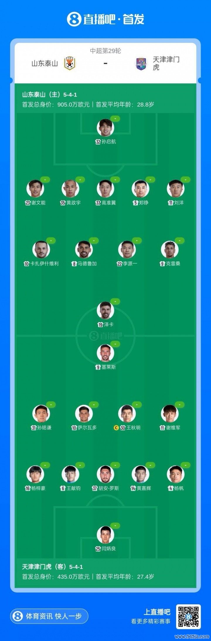 11月01日讯 北京技能本日15:30,中超第29轮,山东泰山主场收官战迎战天津津门虎。赛前两边的首发声威出炉,泰山队外助路易斯因伤缺席,王大雷有伤无法出场,孙动身担任首发门将,这是他在泰山队一线队的首秀,天津队外助基莱斯、罗斯和萨尔瓦多首发登场。