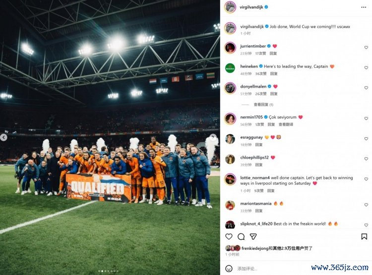队长范戴克也在社媒晒出全队庆祝晋级的合影,配文写谈:“任务完成,寰宇杯咱们来了!”