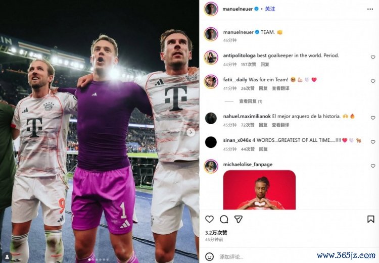 11月5日讯 拜仁在本轮欧冠焦点战2-1力克巴黎,诺伊尔在赛后通过社媒庆祝见效。