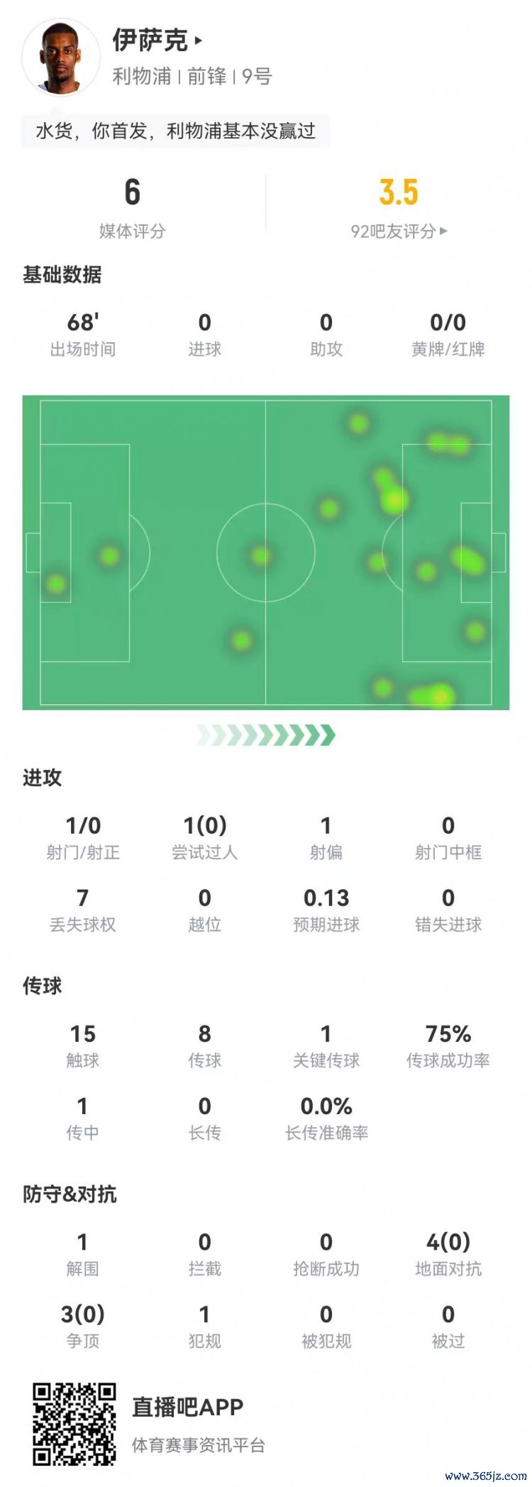 11月23日讯 利物浦在本轮英超0-2逾期诺丁汉丛林,伊萨克本场数据如下: