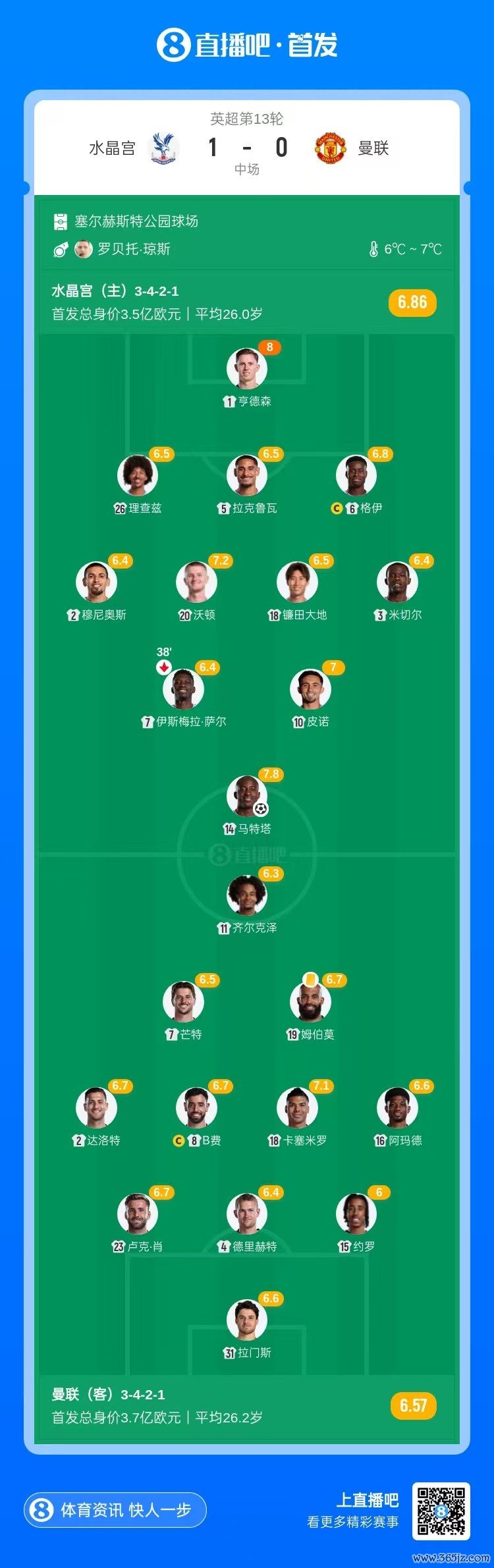 半场-曼联暂0-1水晶宫 约罗送点 马特塔点射二触被取消+重罚再进