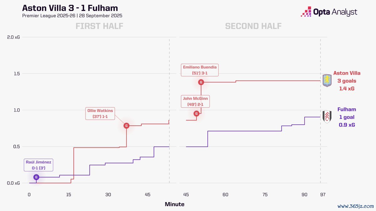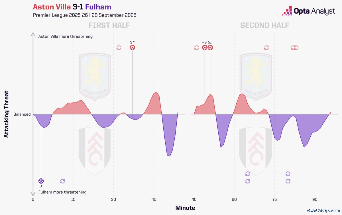 笔据Opta赛后的比赛趋势图(图3),本场比赛富勒姆在更多期间占据比赛上风,但维拉借助中场休息后的上风区连入两球拿下了比赛。
