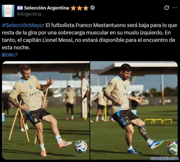 阿根廷官方写谈:“球员马斯坦托诺的左大腿肌肉过度疲困,将缺席接下来的巡回比赛。与此同期,队长梅西也将缺席今晚的比赛。”