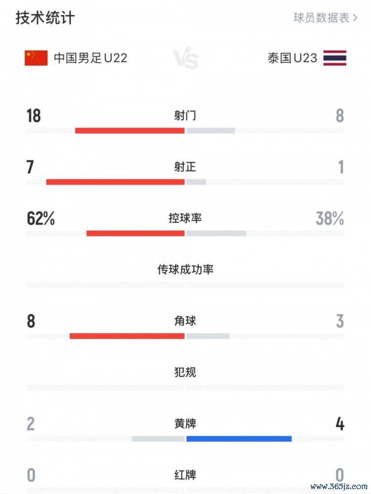 在此前两队的首场比赛中,中国U22男足以3-1打败了泰国队。昨天两队再次交锋,中国U22男足并莫得派上一说念主力,王钰栋和蒯纪闻齐坐上了替补席。上半时比赛中,刘诚宇的头球曾击中对方门柱,很可惜没能破门。下半时,中国U22男足连气儿换上了9名球员,其中包括了王钰栋、蒯纪闻、李新翔、拜合拉木等主力。全场比赛,中国U22男足射门18次,控球率达到了62%,但永恒无法将上风改动为进球。