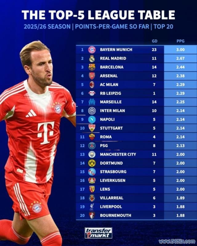 《转会商场》统计了本赛季五大联赛球队的场均拿分情况,拜仁、皇马、巴萨、阿森纳分列前四。本赛季五大联赛场均拿分榜(及净胜球数):