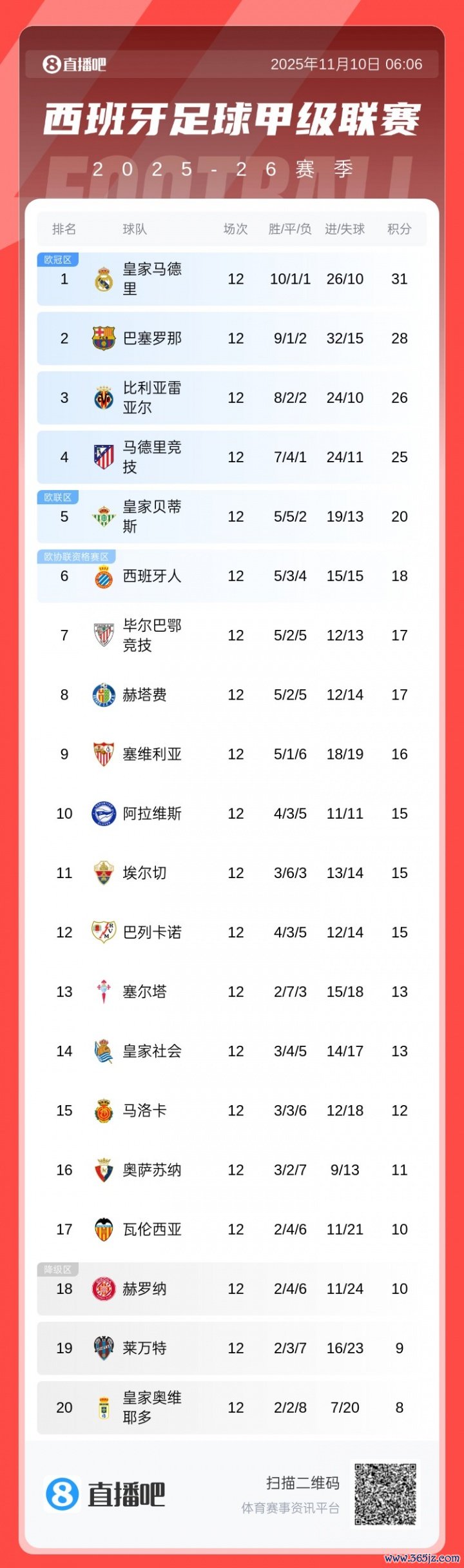 西甲积分榜:皇马本轮战平3分上风领跑,巴萨28分第二,马竞第四