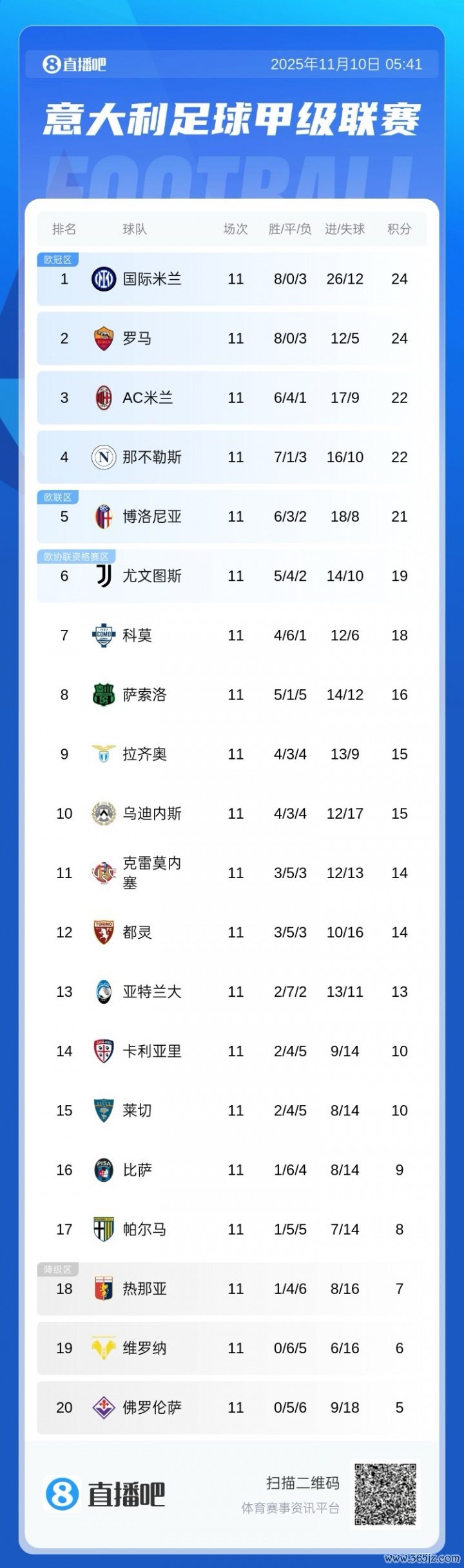 意甲积分榜:国米3连胜登顶!罗马同分第2 米兰那不勒斯过期2分