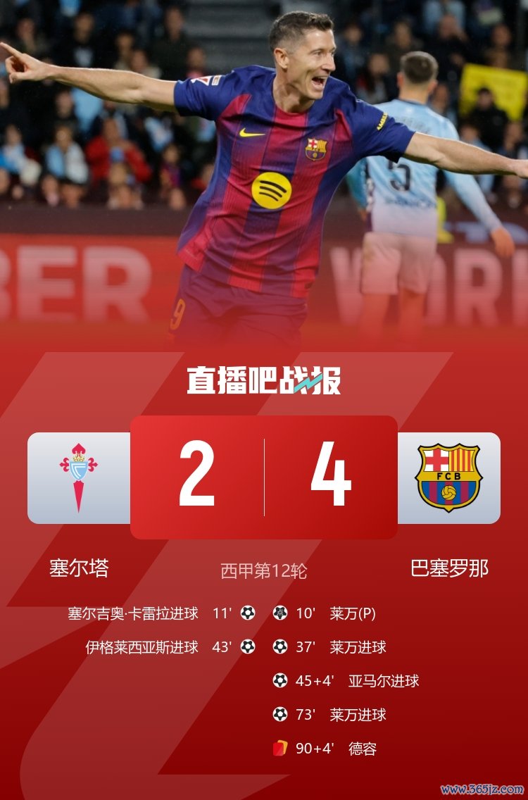 联赛两连胜!巴萨4-2塞尔塔过期榜首3分 莱万戴帽亚马尔破门
