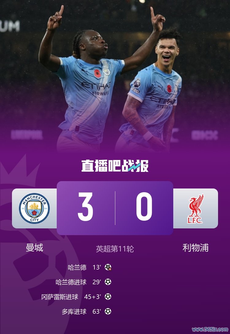 距榜首4分!曼城3-0利物浦 哈兰德失点+头球破门多库寰宇波+造点