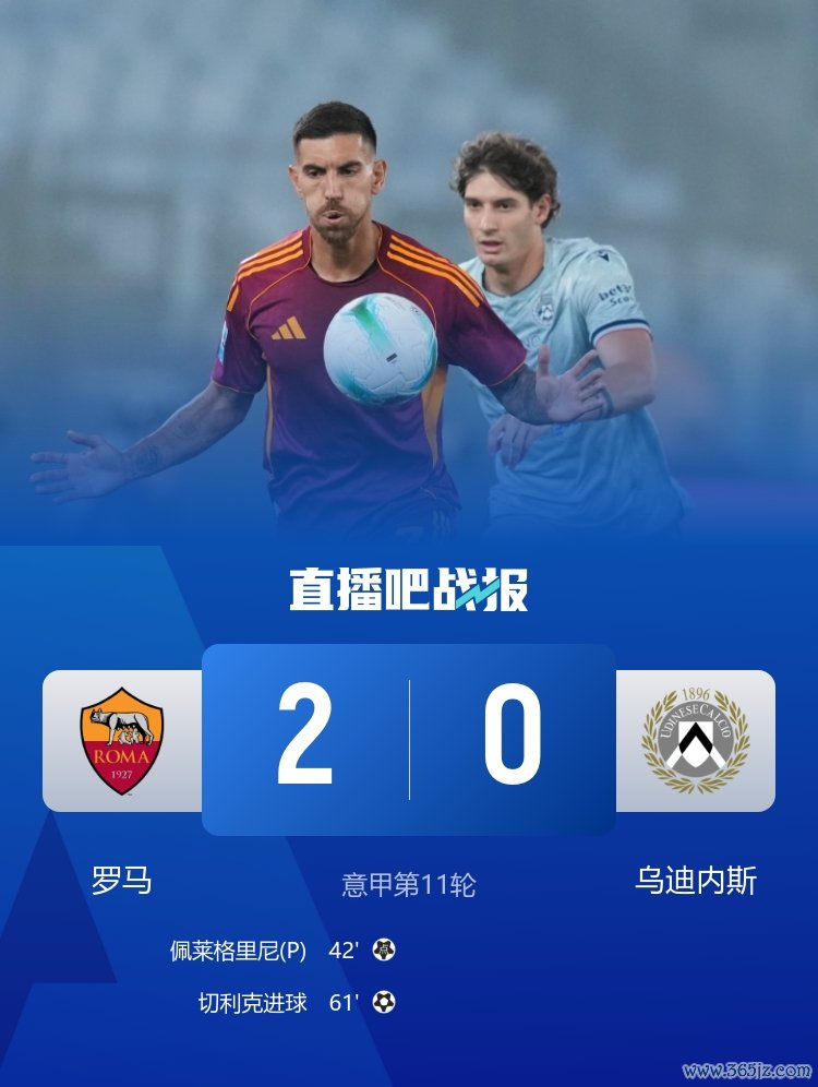 意甲第11轮,罗马2-0校服乌迪内斯,佩莱格里尼、切利克进球。