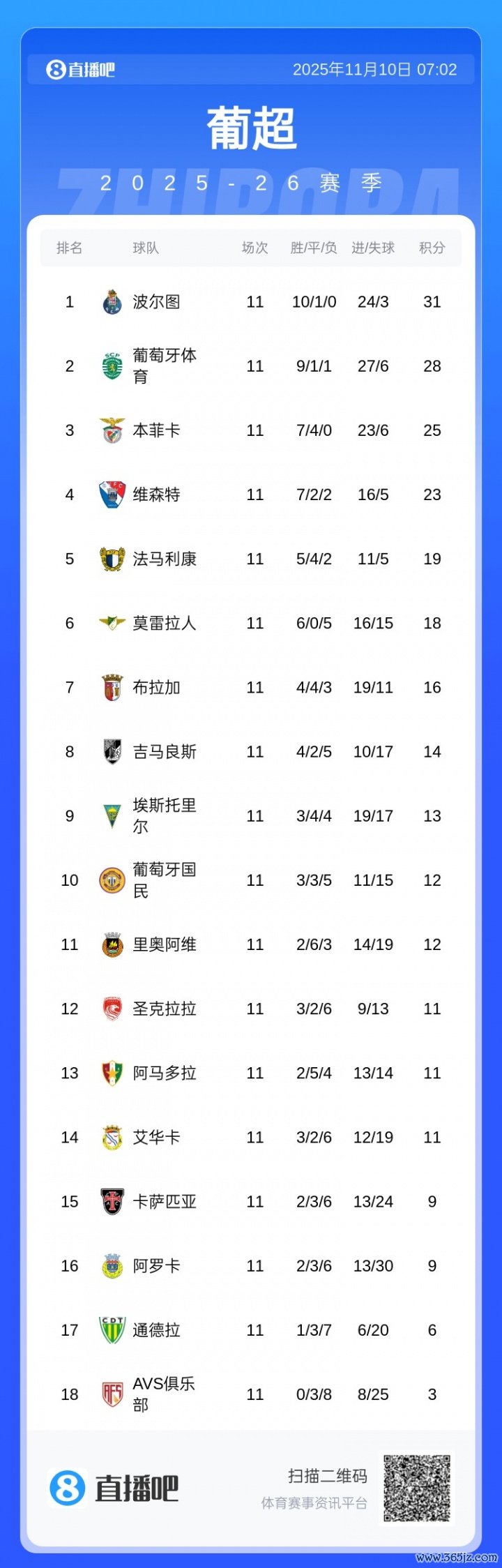 11轮联赛事后,本菲卡暂积25分排行积分榜第3,过期榜首的波尔图6分。