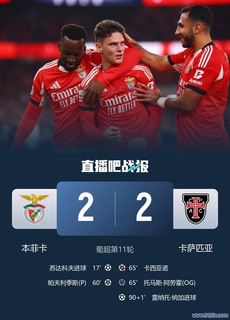 11月10日讯 葡超第11轮,本菲卡2-2卡萨匹亚,卓绝两球的情况下遭敌手补时绝平。