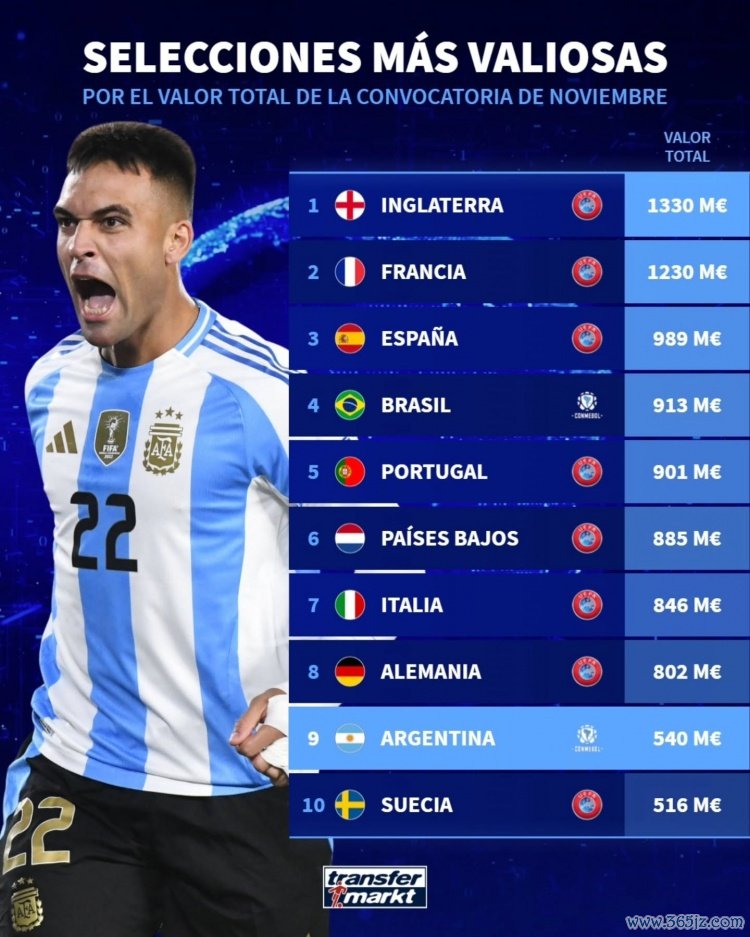 11月15日讯 德国转会阛阓统计了11月海外比赛日列国度队的身价,比肩出榜单,英格兰、法国、西班牙前三,阿根廷排在第九位。