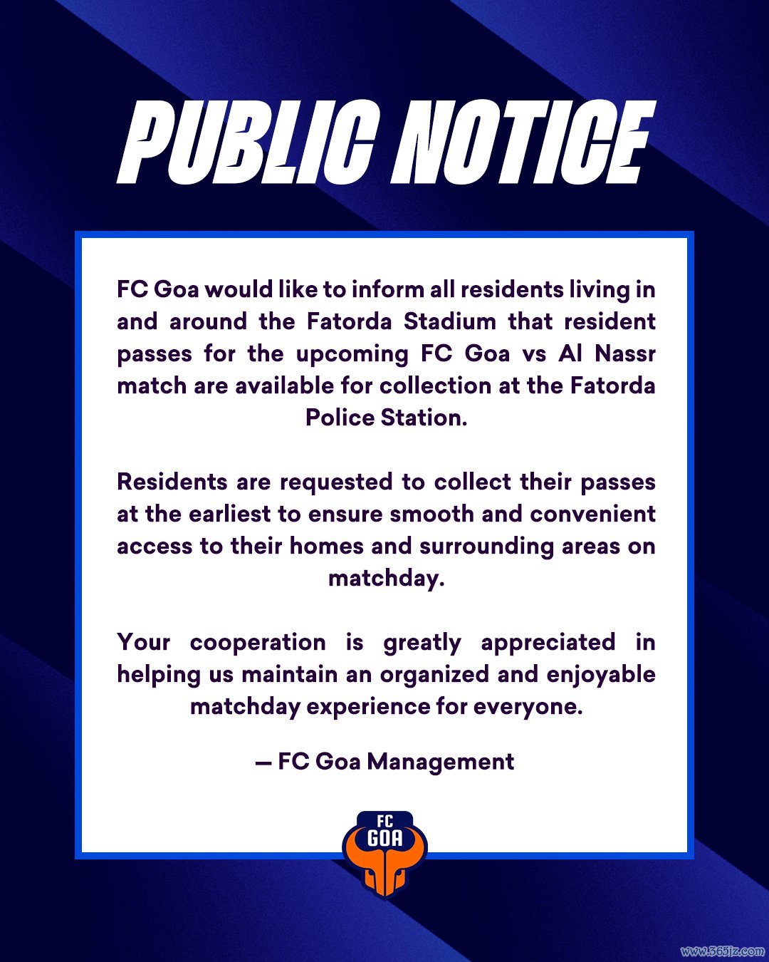 雷速体育10月22日讯 印度球队FC果阿发布官方公告,在与利雅取得手的亚冠二级比赛当日,比赛花样附进区域将阻塞,住户需领通行证出行。